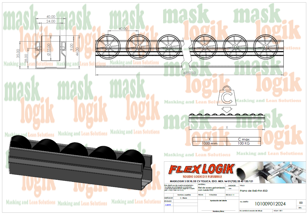 Riel de acero galvanizado con rueda negra ESD 40mm x 4mts.