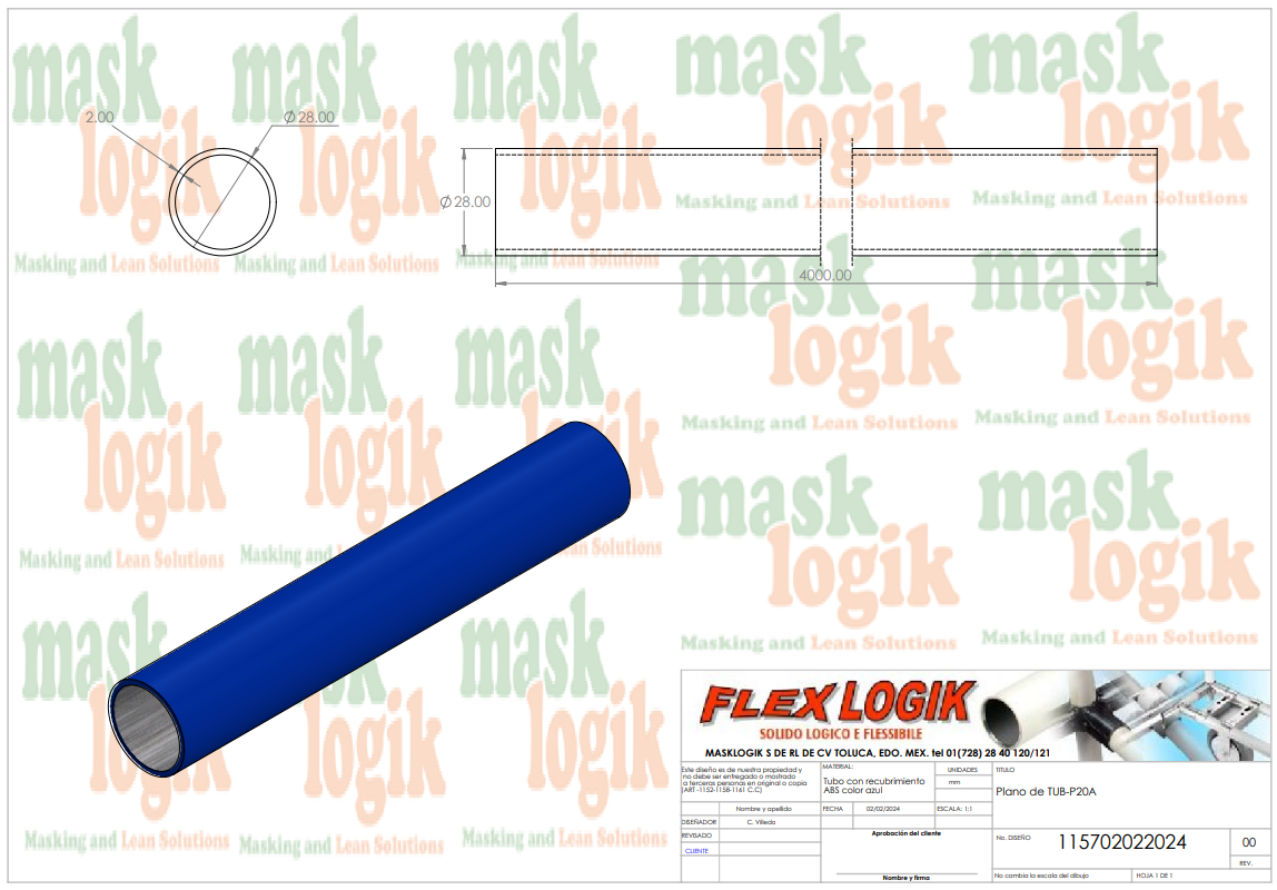 Tubo lean de acero al carbón cubierto con ABS color azul dimensión exterior 28mm x 4mts, espesor 2.0mm