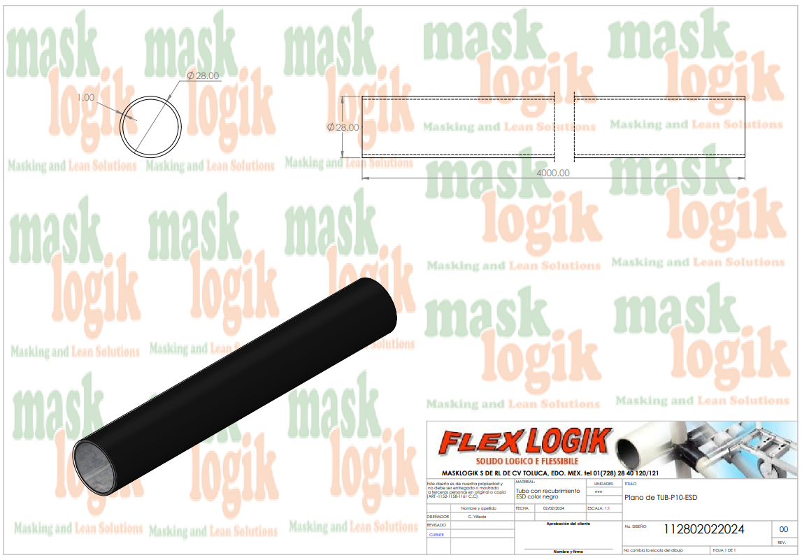 Tubo lean ESD de acero al carbón cubierto con ABS color negro para descarga electrostática, dimensión exterior 28mm x 4mts, espesor 1.0mm